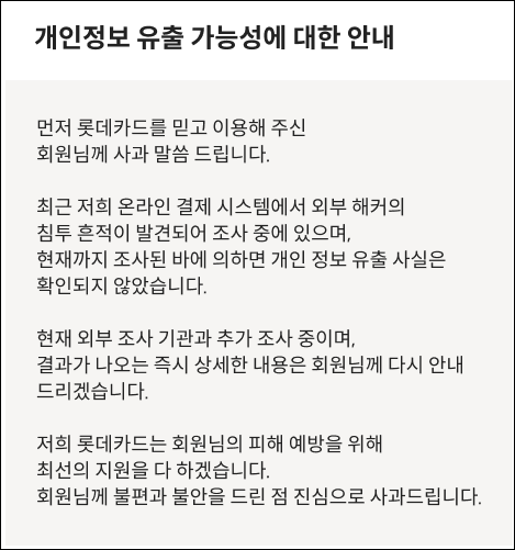 이번 사건은 지난달 26일 일부 서버에서 악성코드가 발견되면서 본격적으로 조사에 착수하게 됐습니다. 롯데카드는 추가적인 백신 설치, 악성코드 진단 조치 외에도 정보 유출이 의심되는 고객을 대상으로 카드 비밀번호 변경 안내 등 추가 보안 조치를 시행할 계획이라고 금융감독원에 보고했습니다.